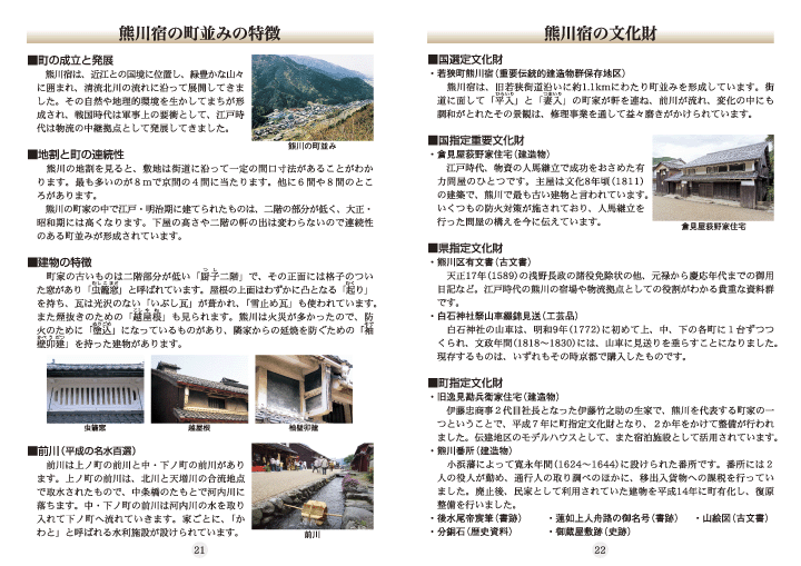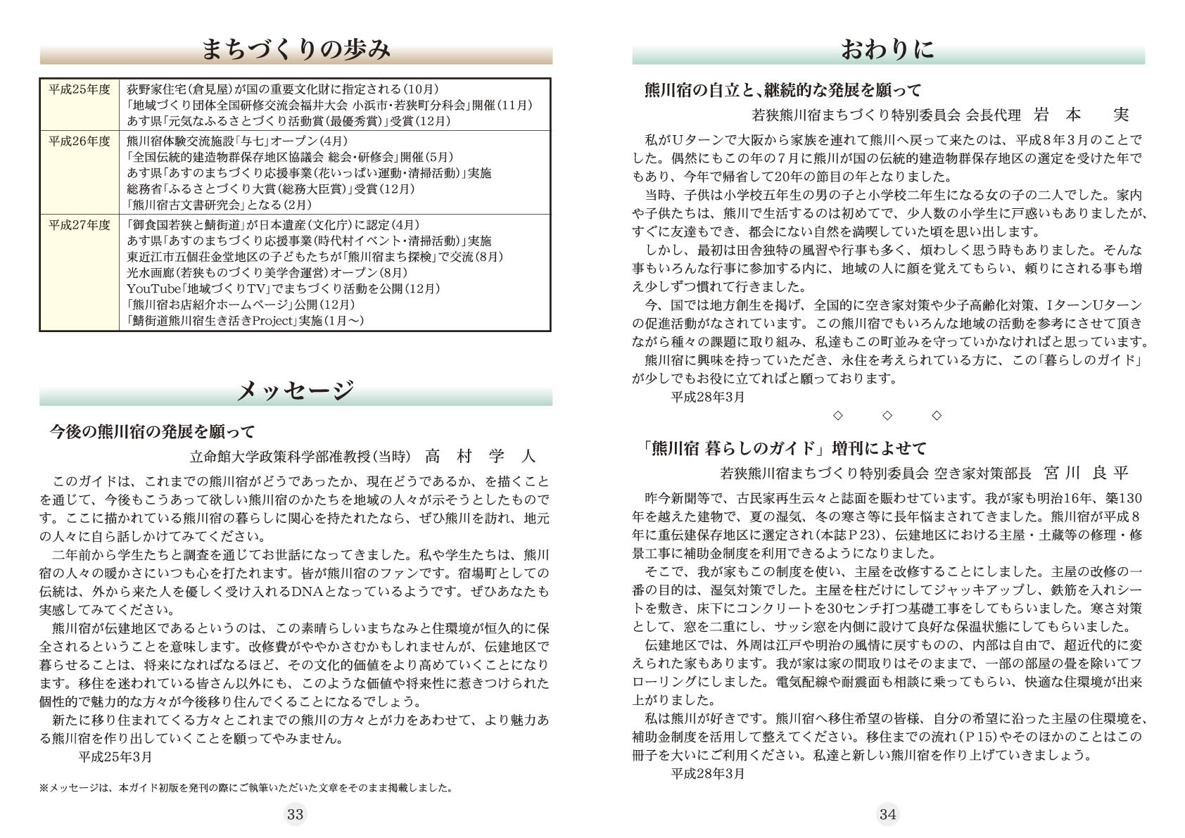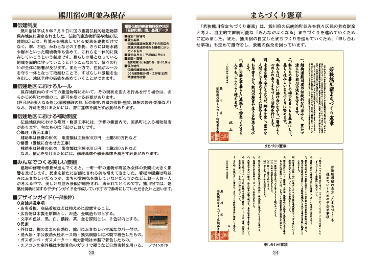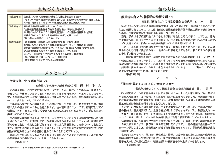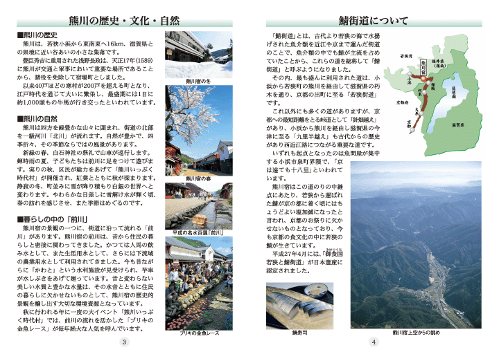 熊川宿での生活をお考えの方のためのガイドブック「熊川宿暮らしのガイド」は、平成24年度に社団法人近畿建設協会や立命館大学政策科学部高村教授のご協力を得て製作したものです。今回、熊川宿へ何度もお見えになるリピーターさんからの要望もあり改訂版を増刊しました。