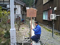 熊川宿には歴史的いわれのある各所に案内看板を設置していますが、近年老朽化が著しいもの、破損して撤去されたものについて、今回、町並みに合った看板の製作設置を行いました。看板の字は隣集落の書道家によるもので、これによりわかりやすく伝えることができるようになりました。