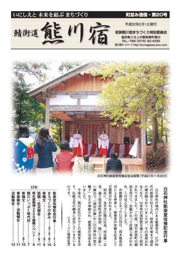 鯖街道熊川宿」は、節目の第20号を発行しました。通常は毎回600部を印刷し、熊川区内配付はもとより、長年お世話になっているまちづくり関係団体や専門家の先生方、行政機関、熊川出身者、ファンクラブ会員に郵送し、また視察研修等の資料として活用しています。今回の記念号は、カラーを含む増ページで1,000部を作成し、これまでよりも幅広く町内外の関係者に配付し、まちづくりのPRと協力要請につなげたいと考えています。