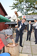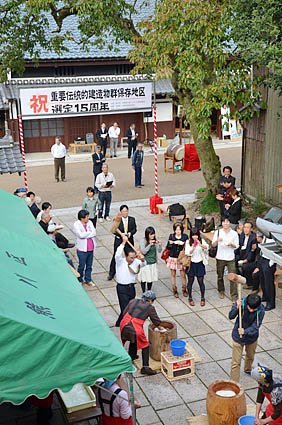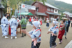第二部の交流会では、熊川宿まちづくり委員会の協力で、お祝いの餅つきが行われ、つきたてのきな粉餅が来場者に振る舞われました。続いて、一乗寺郷土芸能保存会の皆さんによるてっせん踊りと、熊川宿伝統芸能保存会や熊川区民による熊川音頭が披露され、記念事業を締めくくりました。