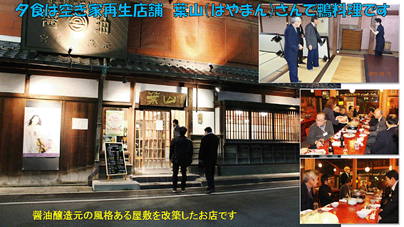 おかみさんに二階を案内していただき鴨料理で懇親しました。大正12年に建てられた醤油醸造元の風格ある屋敷を改築し、一階は椅子席、二階は座敷となっていて、鴨料理などが味わえます。