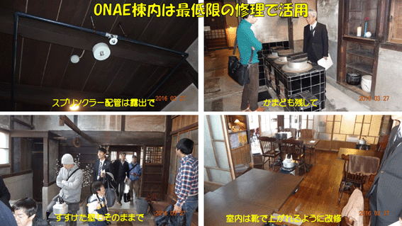 必要最小限の改修と、消防署などからの指導も考慮した安全対策も実施。住居としては満足できなくても、古民家ホテルとしての使用目的には十分マッチした修理です。 レストランや客室は靴のまま上がれるように改修されていました。