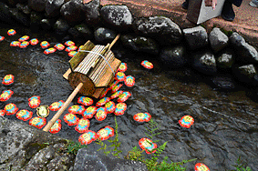 毎年絶大な人気のブリキの金魚レース。スタート付近は大勢のギャラリーが集まり、入賞の夢を託した自分の金魚を追いかけていました。