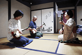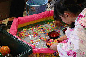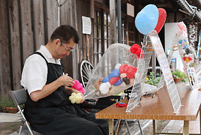 似顔絵&筆遊びのまゆるりさん。リクエストOKの江戸飴細工の鈴木さん。三味線体験は播磨さん。バルーンアートも子どもたちに大人気。