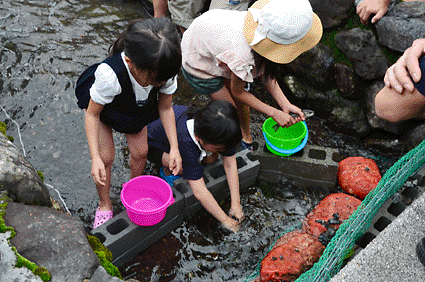 ニジマスつかみどり。雨は関係なしと着替え持参で参加する熱心なリピーターもいる人気ぶり。塩焼きは任して!と近所のプロの調理人。