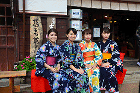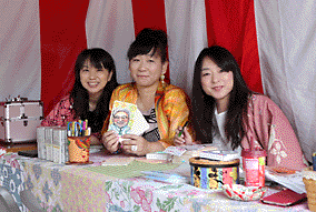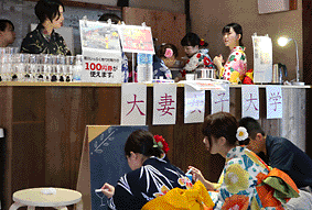 新企画「和装でぶらりまち歩き」が行われ、大妻女子大学からゆかた姿で日本酒カクテルのバザー出店。まさに「笑顔の華咲く時代村」