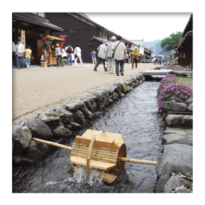熊川宿の歴史的景観に欠かせないのが水量が豊富で流れの速い「前川(用水路)」で、水の郷(さと)百選と平成の名水百選に選定されています。上ノ町を流れる前川は滋賀県の天増川(あますがわ)から、中ノ町・下ノ町を流れる前川は河内川(こうちがわ)から取水しています。重伝建選定後、石積み護岸が復元されました。各所に芋車(いもぐるま)が廻り、家ごとに「かわと」と呼ばれる水利施設が設けられています。防火用水はもとより、夏は打ち水として、冬は雪を流してくれる大切な役割を果たしています。また夏には子どもたちが手足を浸けて遊びます。 熊川いっぷく時代村では、前川の流れを活かした「ブリキの金魚レース」や「ニジマスつかみどり」が毎年絶大な人気を呼んでいます。