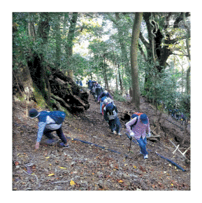 熊川陣屋跡奥と白石神社境内の能楽堂裏手から熊川城跡へ続く山道があります。山頂は海抜185m。若狭熊川城主沼田氏の山城跡で、城郭や張出郭の原形はよく残っているものの、雑木や杉が大きくなり、城跡への山道も急傾斜で荒れ、往来が困難になっていましたが、令和元年から2年に山道の復元整備が行われました。 登山口には鈴の付いた杖が用意してあり、主郭まで片道15分程度で登れます。途中3ヶ所のデッキが整備されました。熊川宿の家並みが見渡せる張出郭デッキ、パワースポットの白樫デッキ、そして頂上の主郭展望デッキからは、緑の山々と河内川ダムの天端が望めます。 熊川城跡は伝建地区から近く、若狭街道に面した山腹には張出郭があります。一方、西からの侵略を守るため、新道地籍には出城を築いていたとのことです。 今後、熊川城跡を通って河内川ダムから若狭駒ヶ岳へさらには沼田氏出城跡方面へのトレイルルートの開発を目指します。 ※登山の際はくれぐれも安全に留意し、自己責任でお願いします。 ※写真上は中条橋付近から見た山城、写真下は城跡への登山道です。 ※熊川城の御城印を若狭鯖街道熊川宿資料館(10)で販売しています。(月曜日休館)