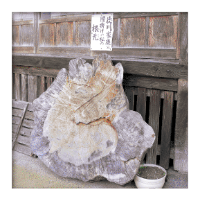 元亀元年(1570)4月、秀吉と家康をも従えた織田信長は越前の朝倉義景を攻めるため、京都から敦賀へ向かう際、熊川で一泊しました。得法寺に泊った家康は、翌朝出発に際し、「土地は熊川、寺は徳法寺、余は徳川、因縁あるかな」と云ったとか。その時境内の松に腰を掛けたことからこの名がいい伝えられてます。その松は平成12年に松食い虫の被害に遭い、枯れてしまいましたが、境内には松の根元と古木が残されています。