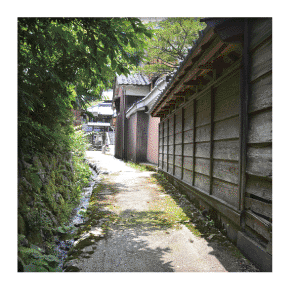かつて北川を往来した舟運の米がこの路地を通り、松木神社境内にあった蔵屋敷に至ったことからこの名がついたそうです。紫陽花(あじさい)や秋桜(コスモス)、南天など季節の草花が、板塀や石垣、水路と調和して情緒ある路地になっています。