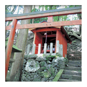 下ノ町から山の中腹まで登った所にあり、伏見稲荷大社より勧請されたといわれ、創建は少なくとも江戸時代中期まで遡れます。 商売繁盛の神様として信仰され、秋の大祭には「おひたき」の神事が行われてきました。現在も近隣の住民有志により連綿と守り継がれています。 近年の台風などによる倒木などで山道が荒れており、今後の整備が望まれます。 ※登山の際は安全に十分ご注意下さい。
