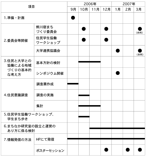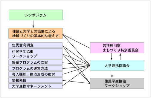 若狭町は町内に大学や高等専門学校等を持たないものの、福井大学や、京都市内の大学から車で1〜2時間程度の距離であり、また、これまでの町並み保存の取組を通じて、東京大学、関東学院大学等との交流もある。そこで、本事業では、鯖街道熊川宿の地域資源を大切にした持続的発展の仕組みを考案するため、「住民と大学の連携協力」、「地域資源の活用と人材育成」という2つの観点から、以下の3つの事柄について具体的な提案を行うものである。